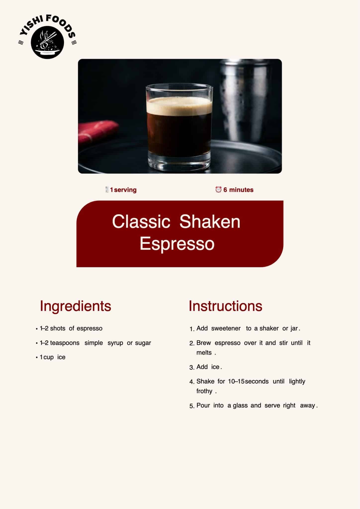 Shaking espresso cools it fast and introduces small bubbles that soften the taste. Add espresso, sweetener, and ice to a shaker or jar. Shake hard for ten to fifteen seconds. This quick motion chills the drink, slightly thins the espresso, and creates a light top layer.