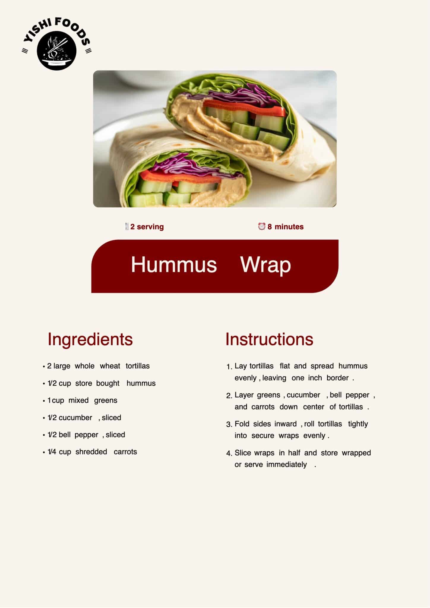 Lay tortillas flat on a clean surface. Spread quarter-cup hummus evenly across each tortilla, leaving a one-inch border around the edges.