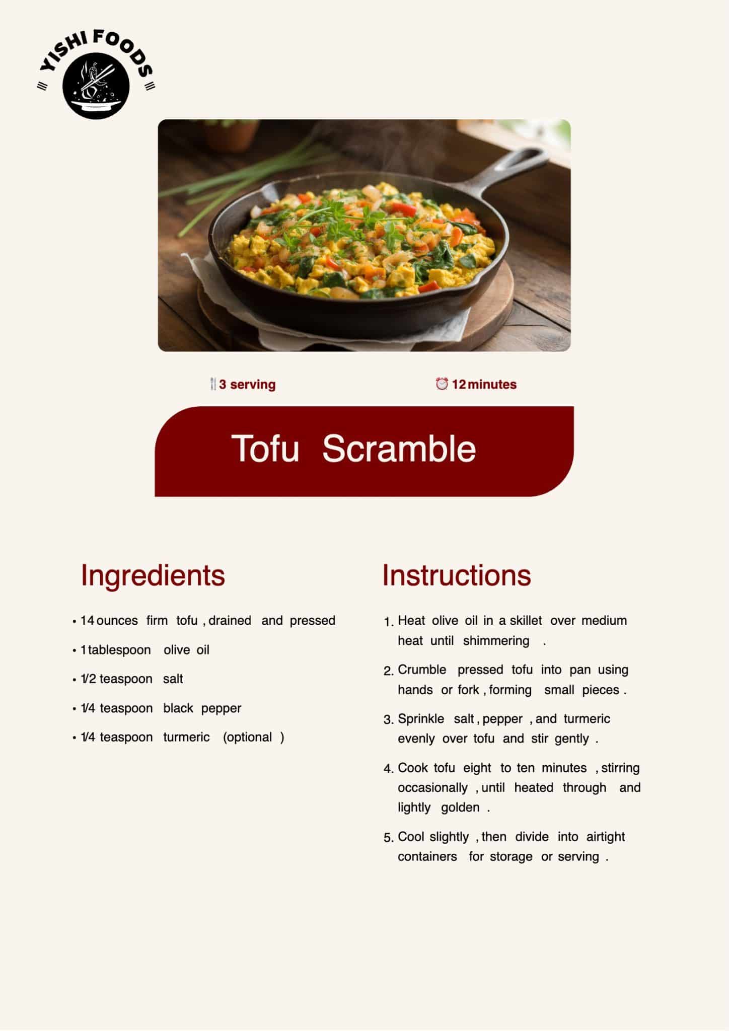 This protein-packed breakfast uses crumbled tofu and basic seasonings, cooks in under fifteen minutes, and stays fresh for five days in the fridge.
