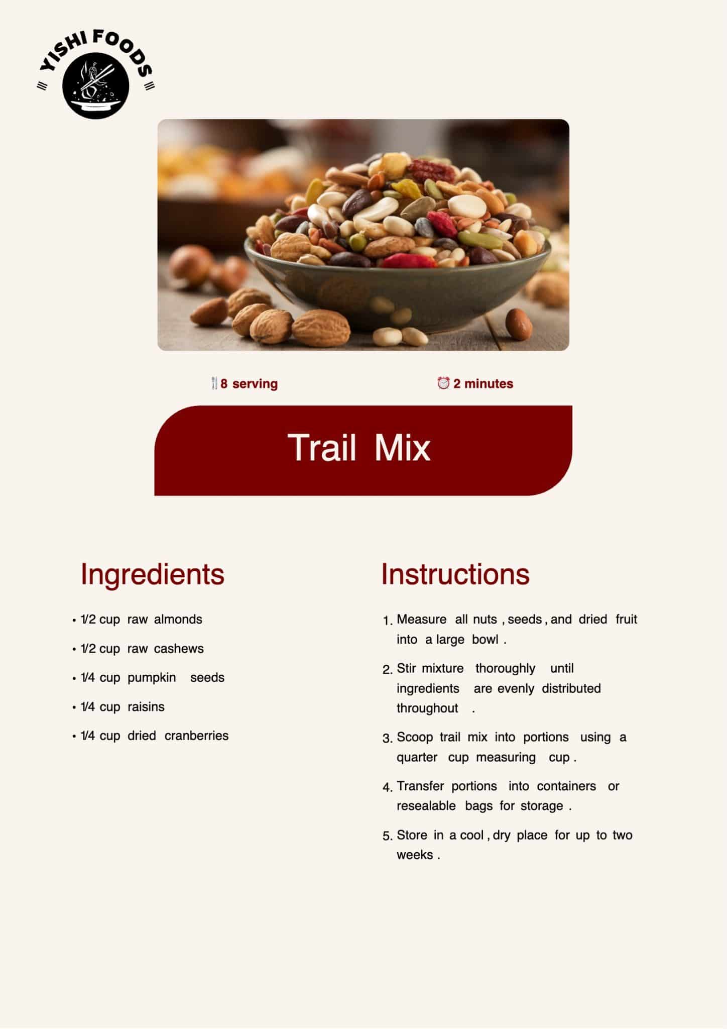 Divide the trail mix into small portions using a measuring cup for consistent serving sizes. Store portions in small containers or resealable bags for grab-and-go convenience. Keep in a cool, dry place for up to two weeks.