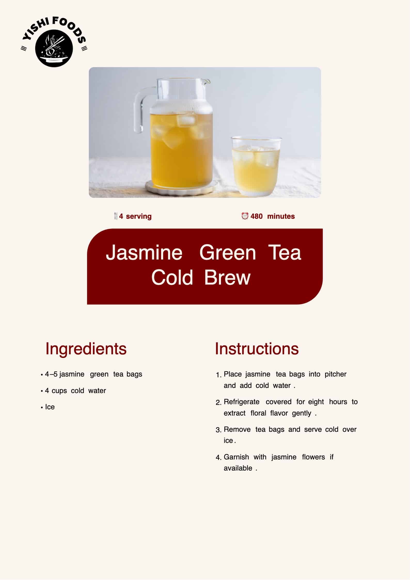 This version uses jasmine green tea for natural floral notes. The cold brew method preserves the delicate jasmine aroma.