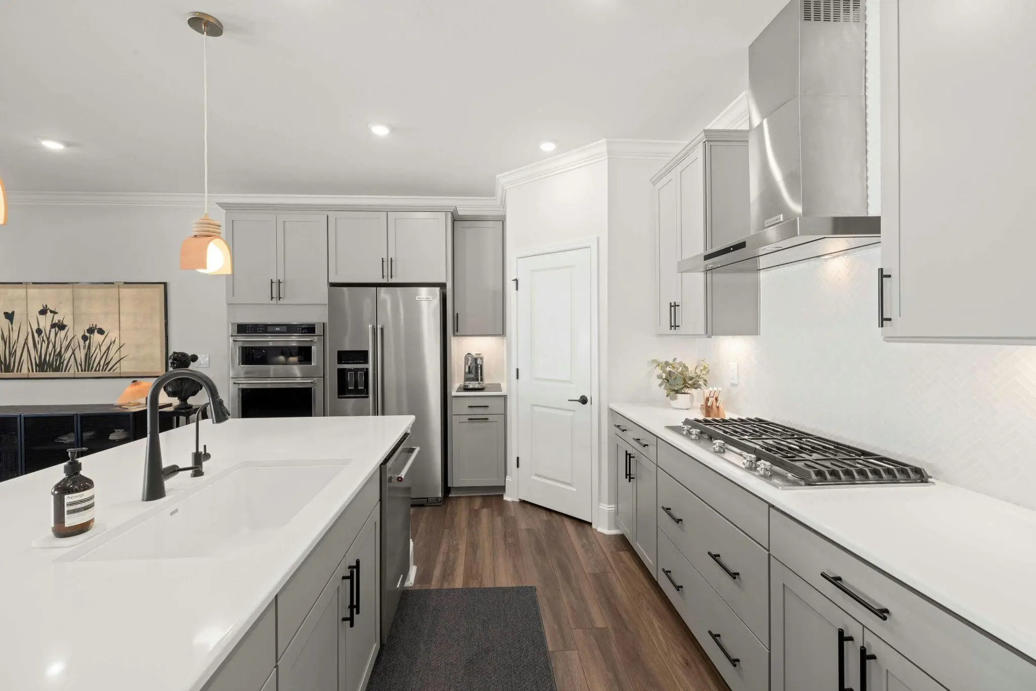 Modern kitchen with white countertops, gray cabinets, stainless steel appliances, and wood flooring