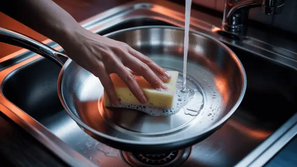 While it soaks, I gently wipe the outside with a soapy sponge to remove light grease, fingerprints, or minor stains. Soaking both surfaces first reduces the need for harsh scrubbing and helps preserve the pan’s polished finish over time.